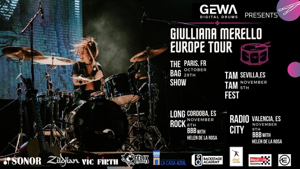 Merello (drummer for Latin star Karol G and Top Queens) will perform at The Bag Show in Paris on October 29, and later, on November 5, she will be part of the Tam Tam Drum Fest in Sevilla (Spain). On November 8 the Argentinean-born drummer will perform in Córdoba (Spain) with BBB, the project she shares with Montra de La Rosa (Alejandro Sánz, Maro). The trek wraps up on November 9 with Giulliana playing in Valencia (BBB also) at Radio City.